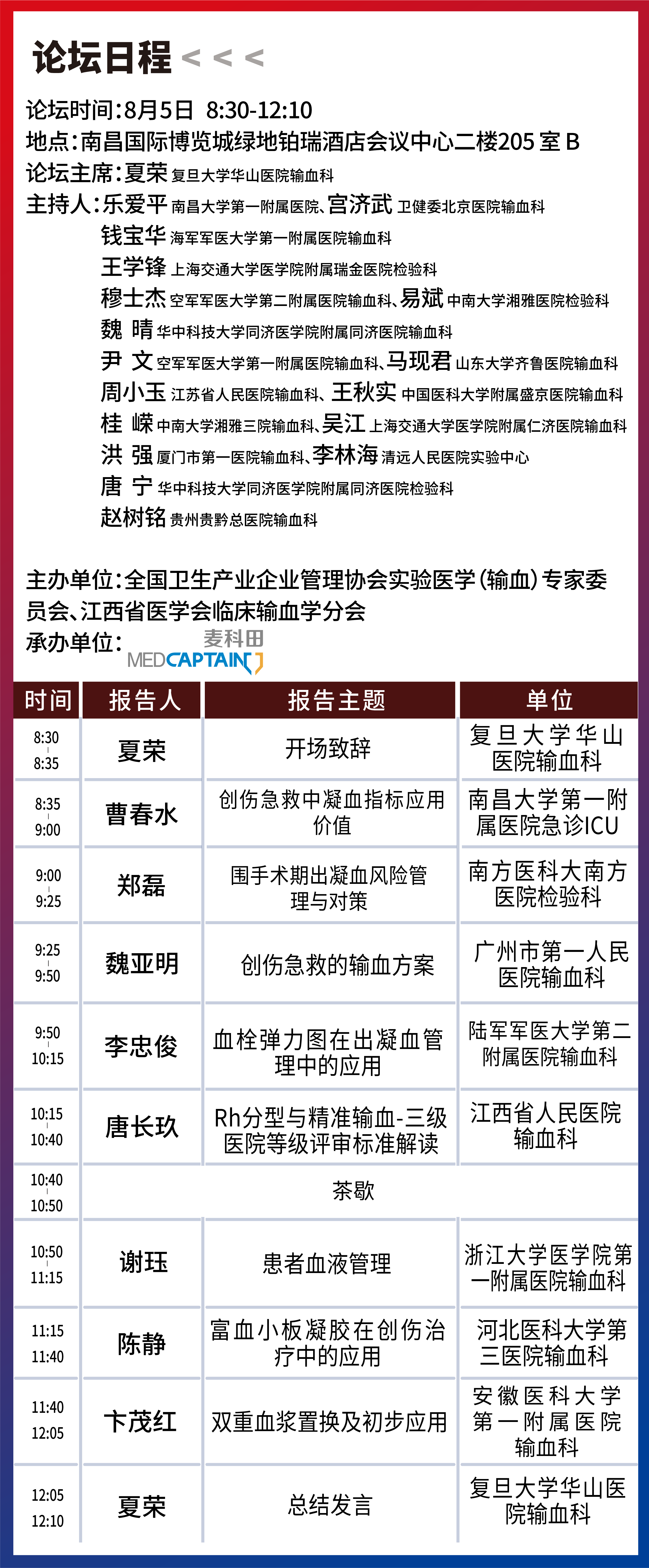 届时,由全国卫生产业企业管理协会实验医学(输血)专家委员会、江西省医学会临床输血学分会主办,深圳麦科田生物医疗技术股份有限公司承办的“创伤急救与输血治疗论坛”也将同期举行。2016年中国国家标准化管理委员会官方网站发布标准公告,在“320临床医学”下增设二级学科32032“输血医学”。这一重大举措对于推进学科发展有很大的意义。随着医疗机构业务量的提高,临床血液输注量增加,为了更好地服务于临床、服务于患者,为救治患者提供科学、合理的血液制剂,多学科之间应该加强沟通,输血必然需要走向临床,参与共同探讨。
