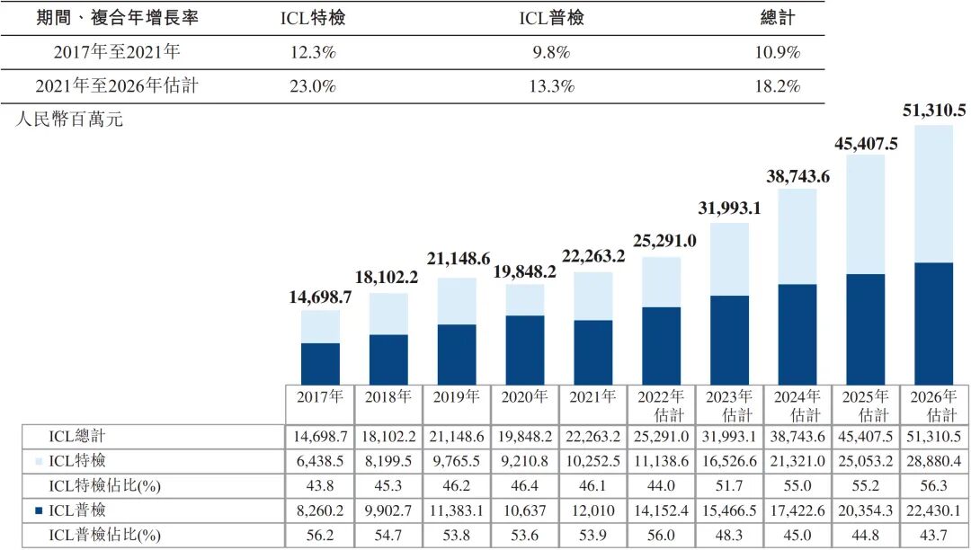中国的ICL市场可被分为普检及特检。中国ICL普检市场由2017年的人民币83亿元增至2021 年的人民币120 亿元,复合年增长率为9.8%,并预计于2026 年达到人民币224 亿元,2021 年至2026 年的复合年增长率为13.3%。