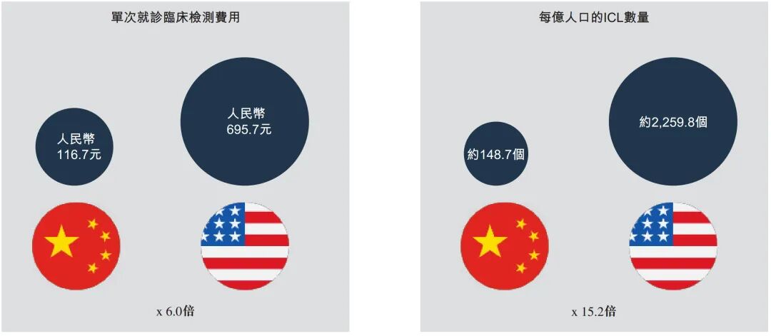 中美临床检测费用及每亿人口的ICL数量对比,2021年