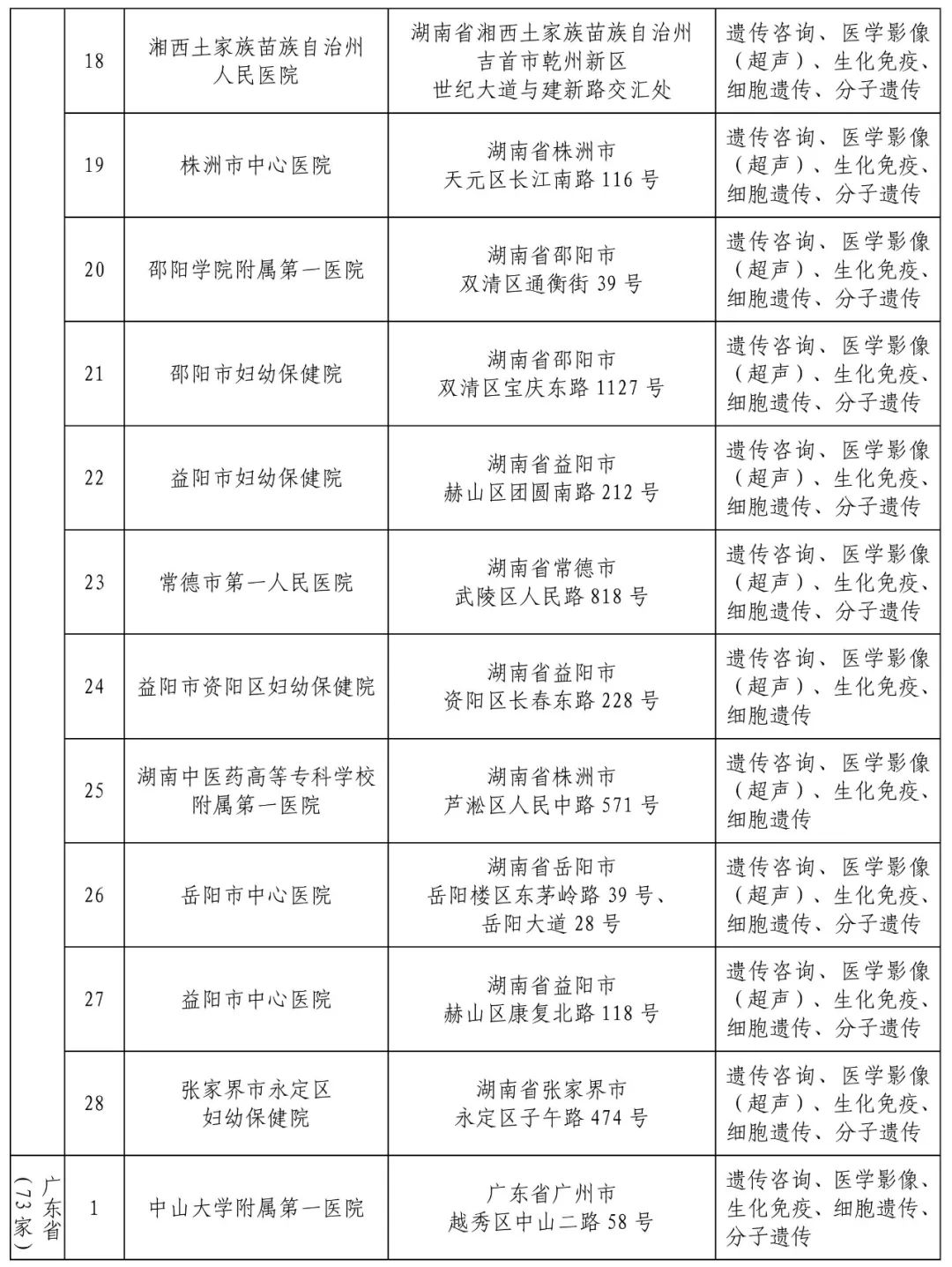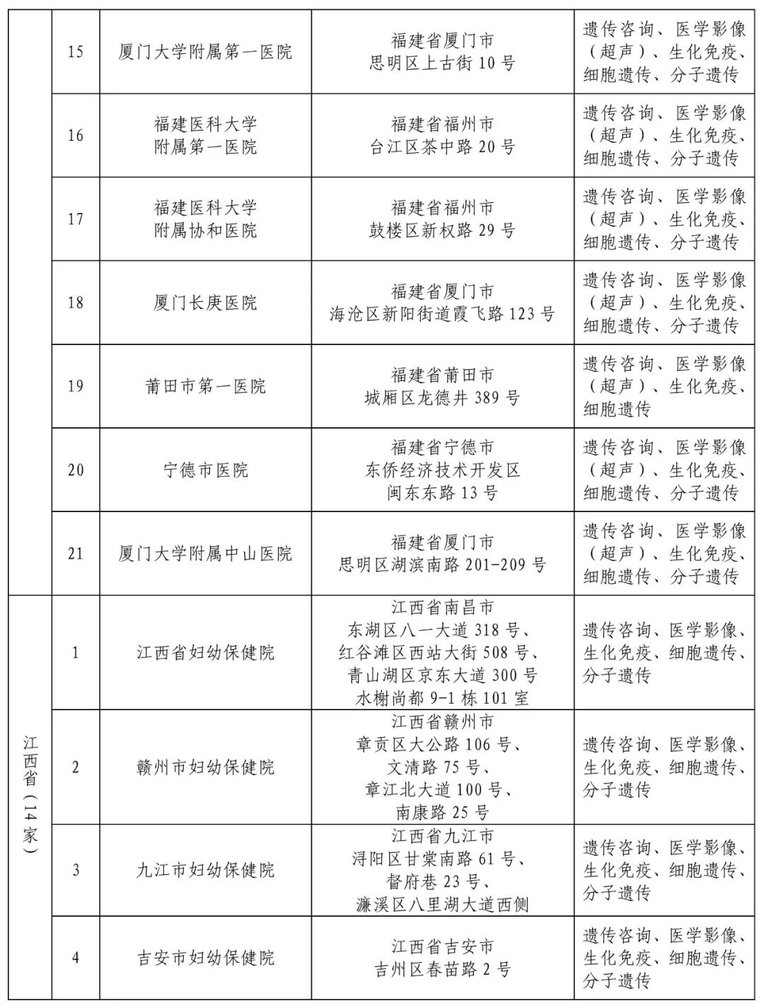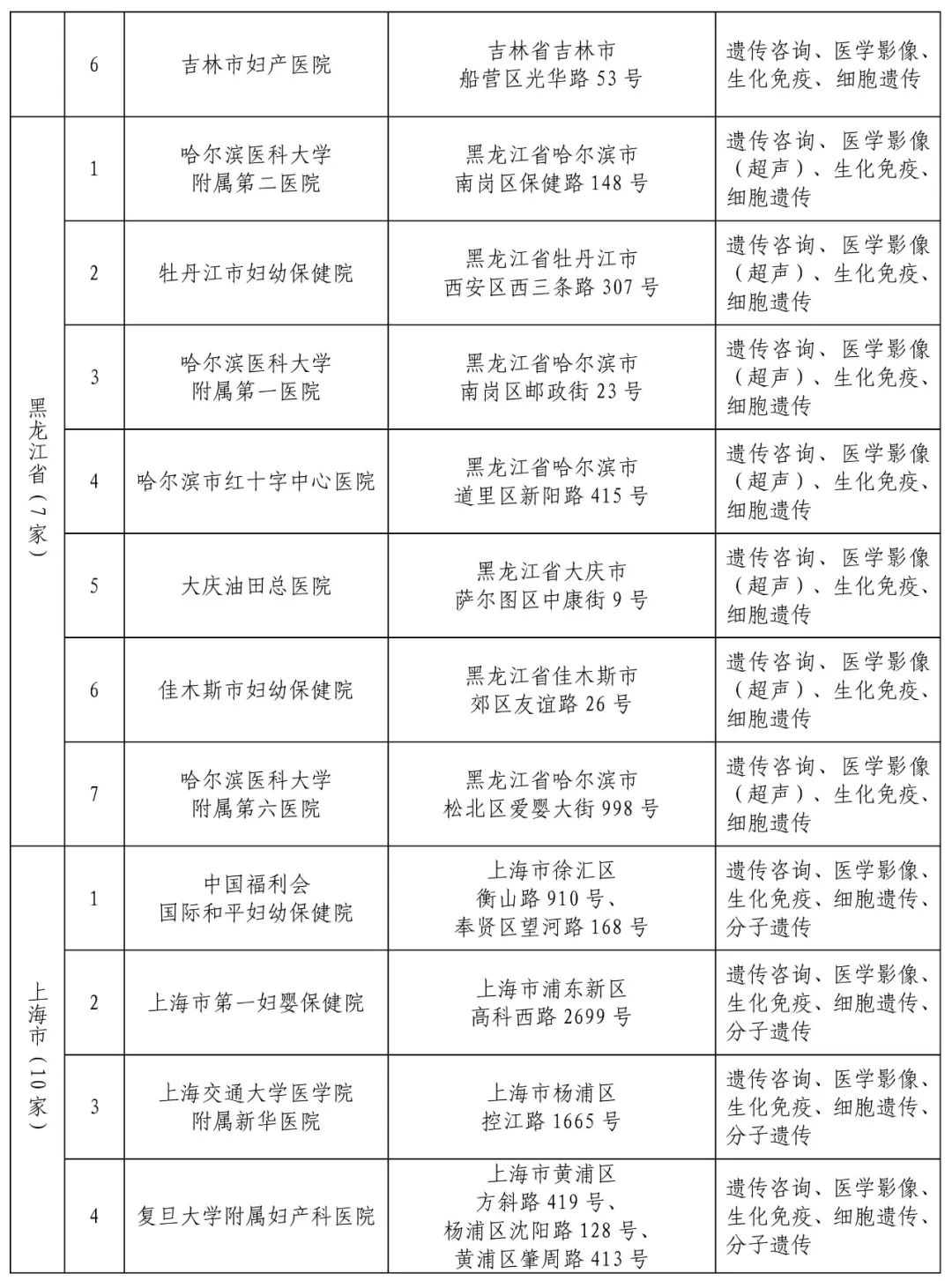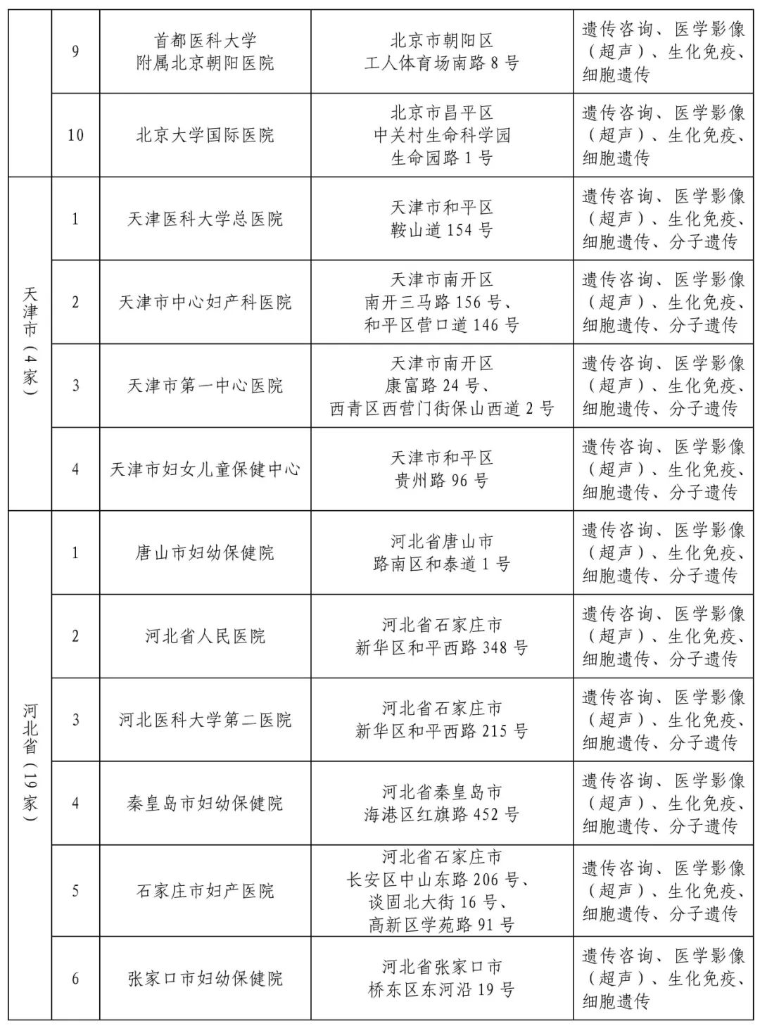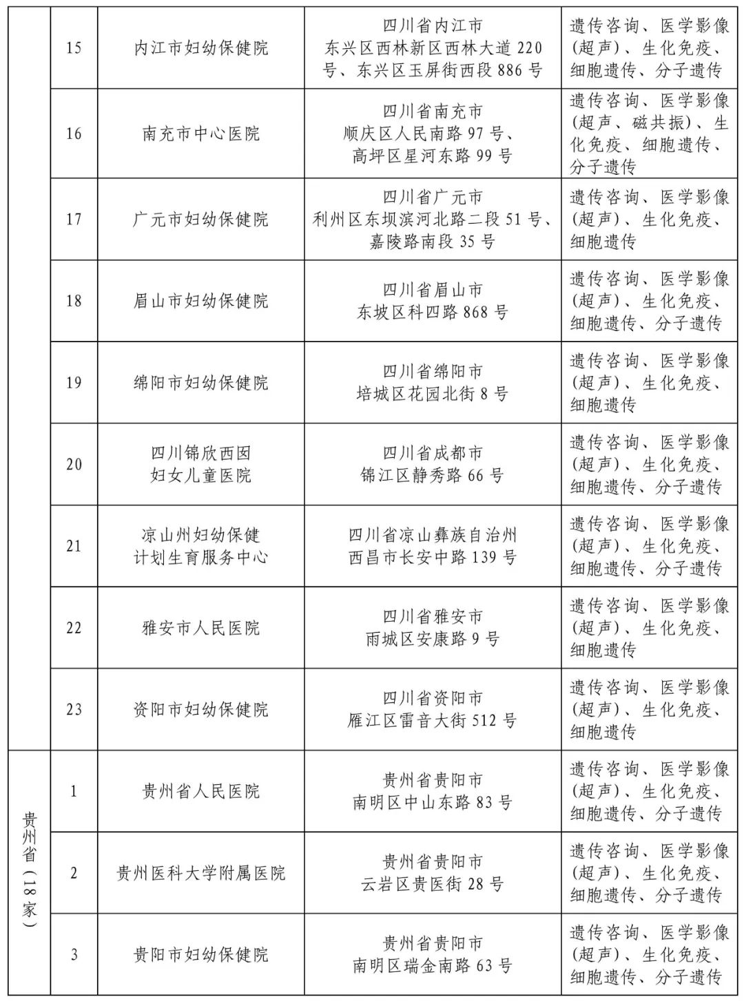 国家卫健委发布了经批准开展产前诊断技术的医疗机构名单(截至 2023 年 6 月 30 日共 527 家,按省级行政区划和机构准入时间排序),其中北京市10家,天津市4家,河北省19家,山西省8家,内蒙古自治区11家,辽宁省22家,吉林省6家,黑龙江省7家,上海市10家,江苏省23家,浙江省22家,安徽省19家,福建省21家,江西省14家,山东省40家,河南省29家,湖北省36家,湖南省28家,广东省73家,广西壮族自治区30家,海南省6家,重庆市6家,四川省23家,贵州省18家,云南省17家,陕西省6家,甘肃省4家,青海省3家,宁夏回族自治区3家,新疆维吾尔自治区9家。详细名单如下。