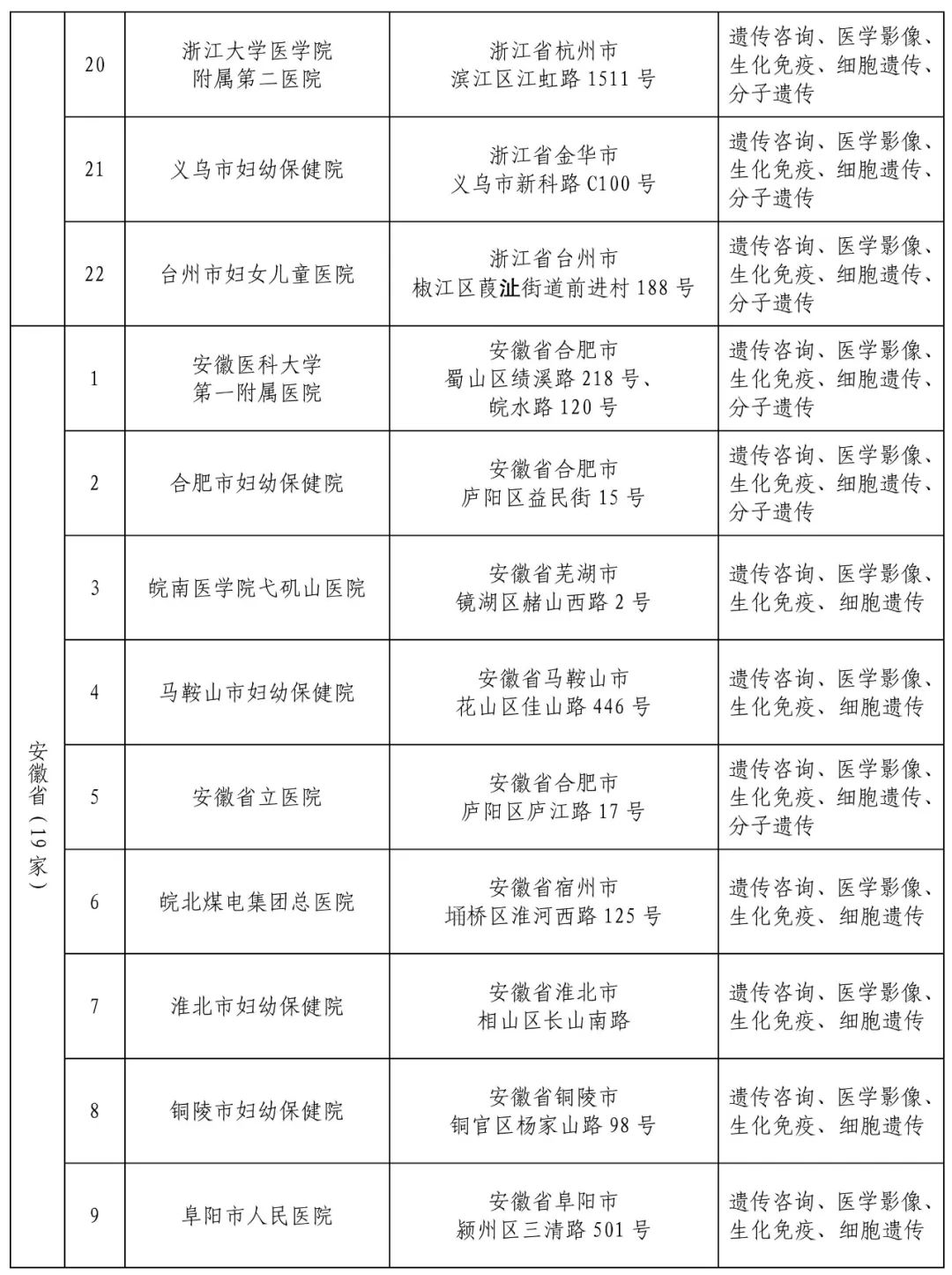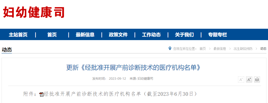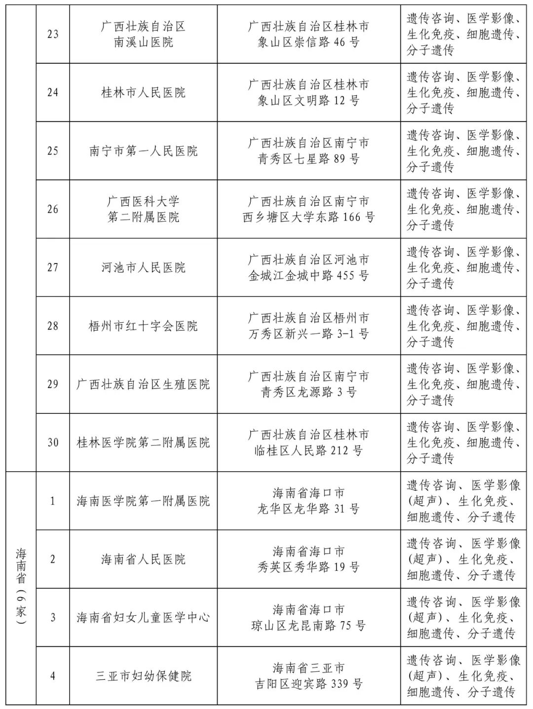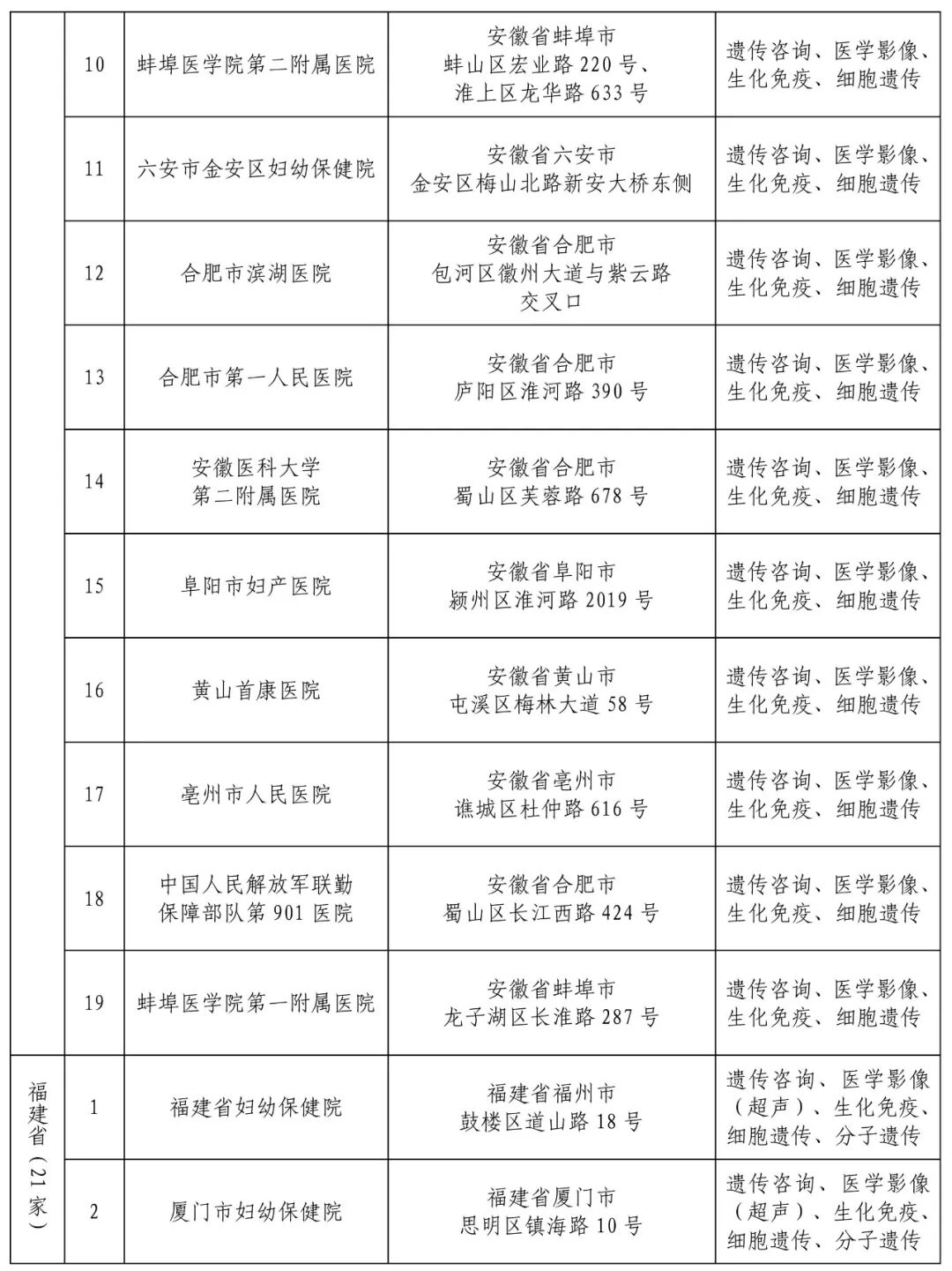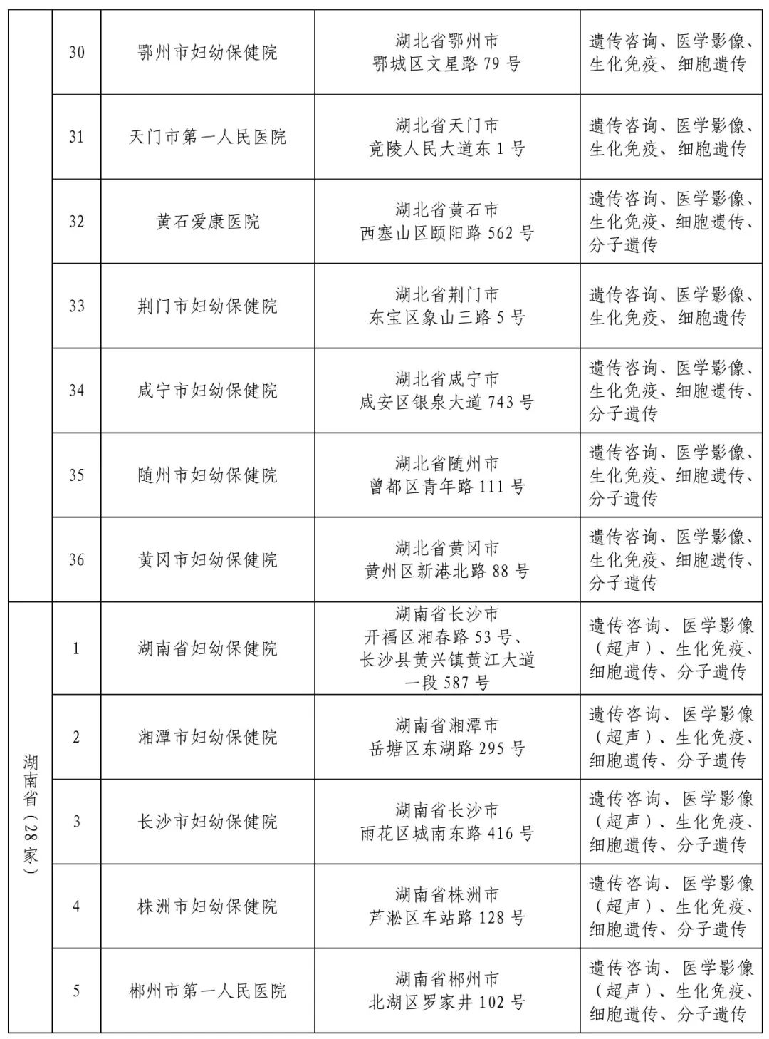 国家卫健委发布了经批准开展产前诊断技术的医疗机构名单(截至 2023 年 6 月 30 日共 527 家,按省级行政区划和机构准入时间排序),其中北京市10家,天津市4家,河北省19家,山西省8家,内蒙古自治区11家,辽宁省22家,吉林省6家,黑龙江省7家,上海市10家,江苏省23家,浙江省22家,安徽省19家,福建省21家,江西省14家,山东省40家,河南省29家,湖北省36家,湖南省28家,广东省73家,广西壮族自治区30家,海南省6家,重庆市6家,四川省23家,贵州省18家,云南省17家,陕西省6家,甘肃省4家,青海省3家,宁夏回族自治区3家,新疆维吾尔自治区9家。详细名单如下。