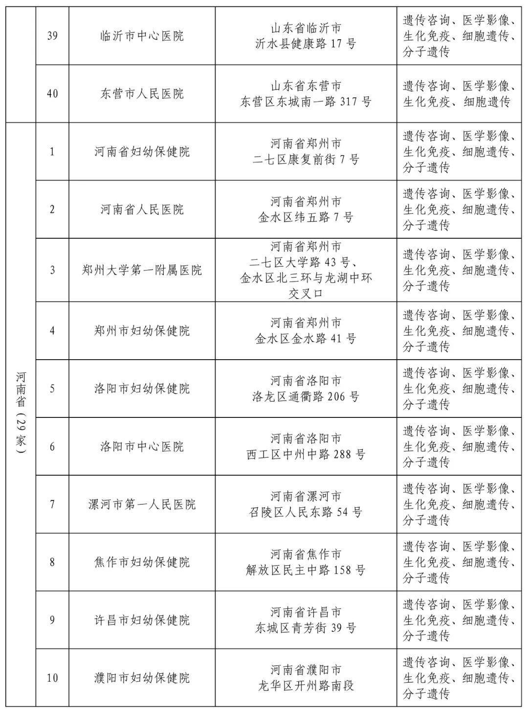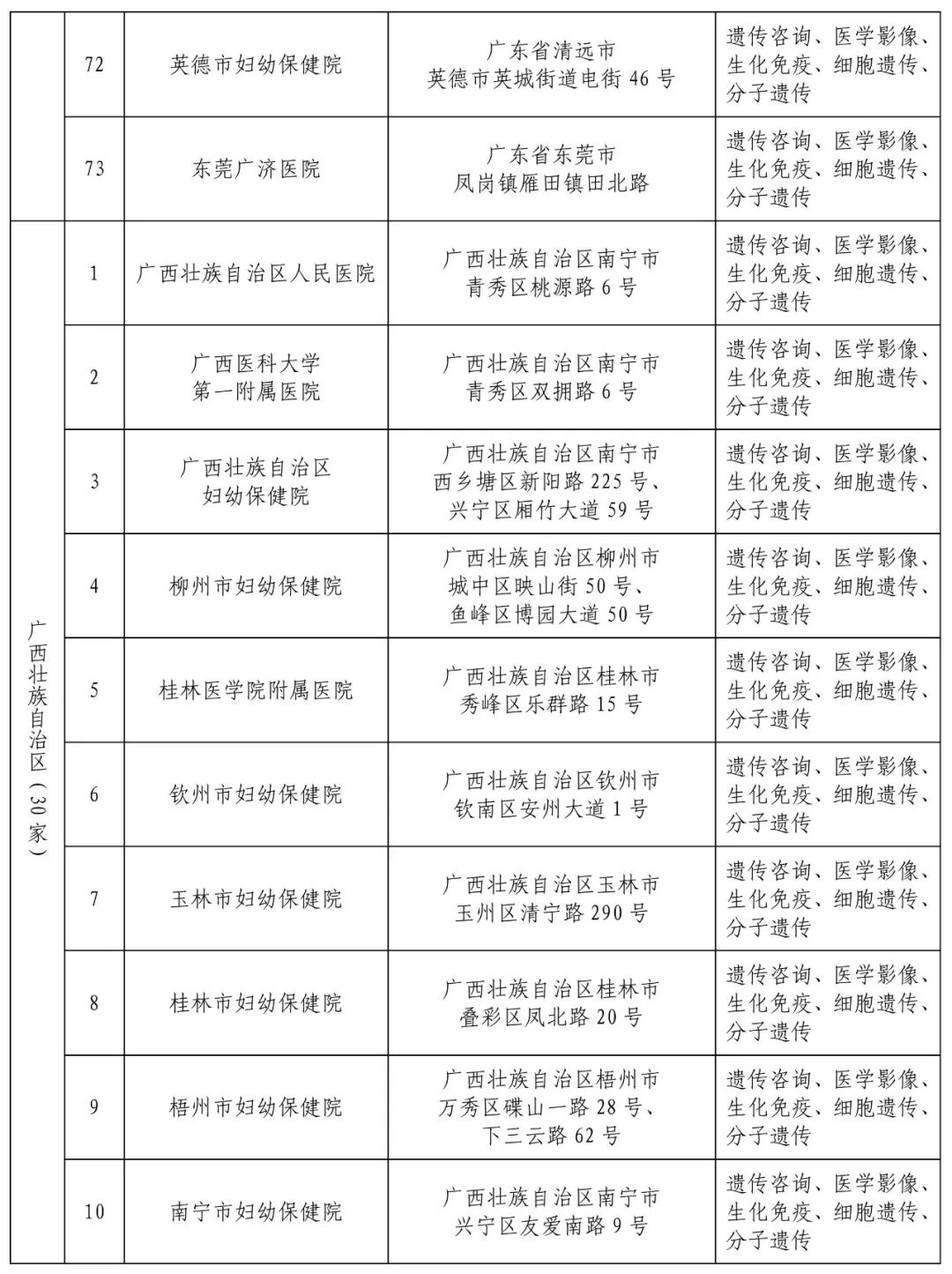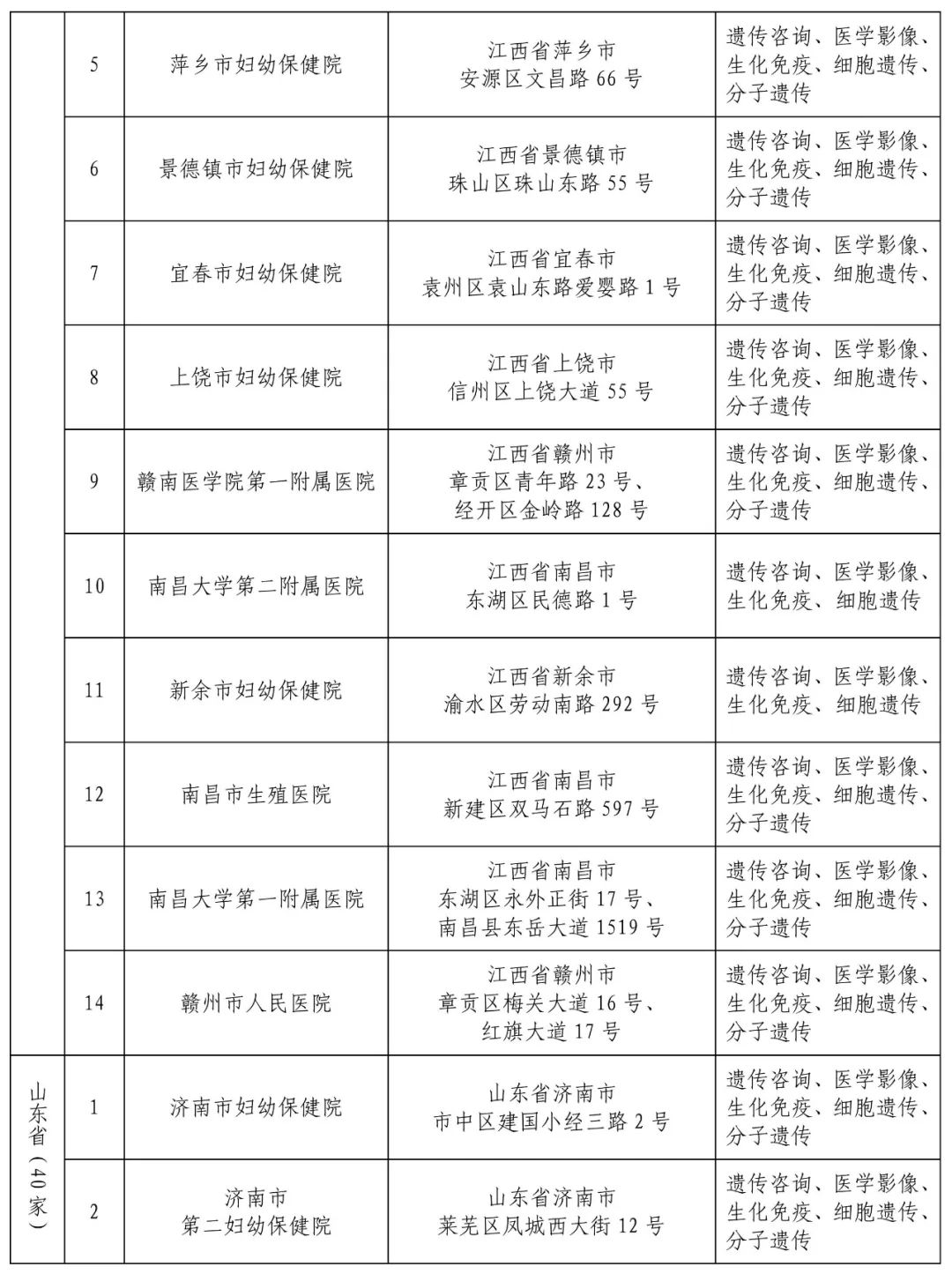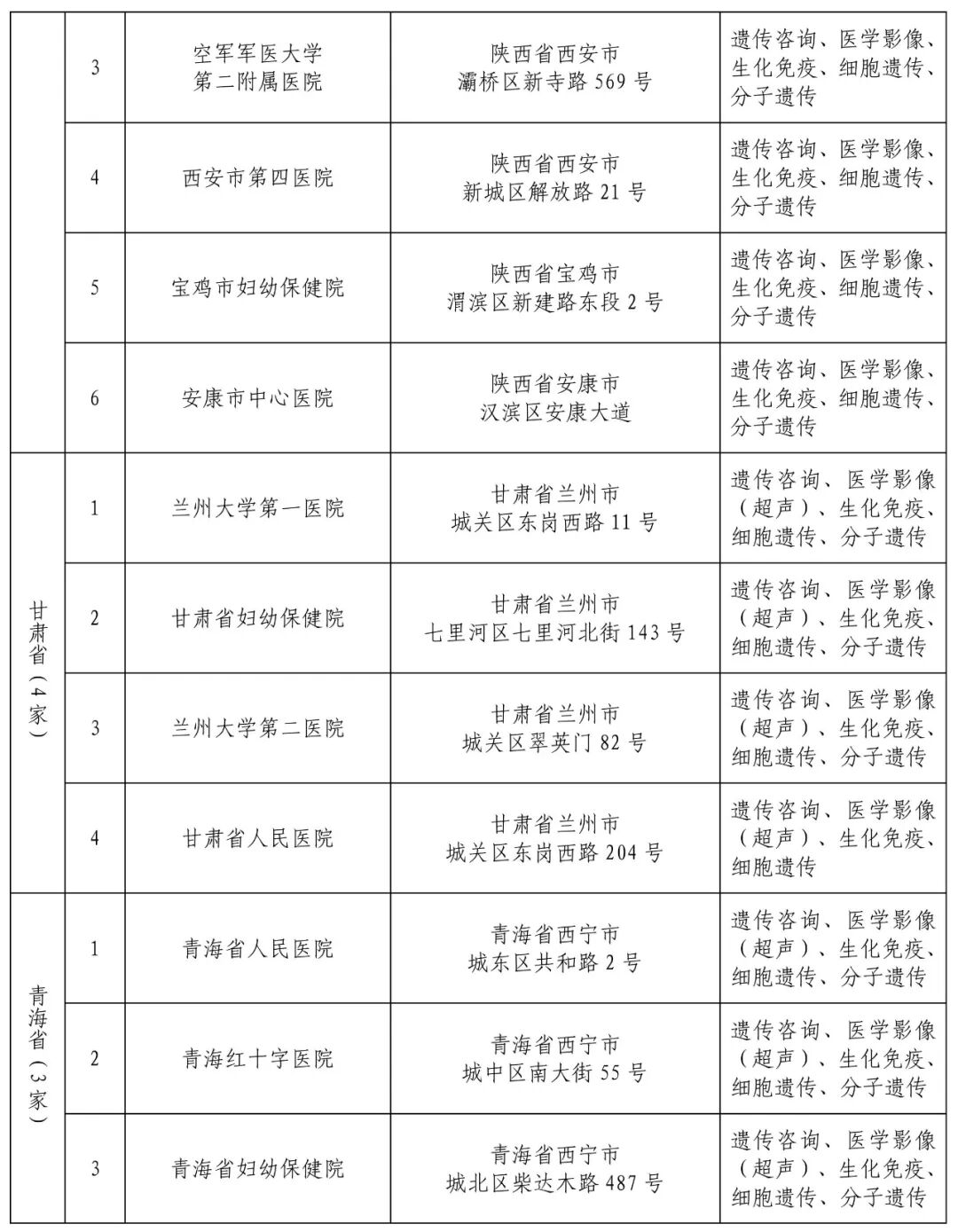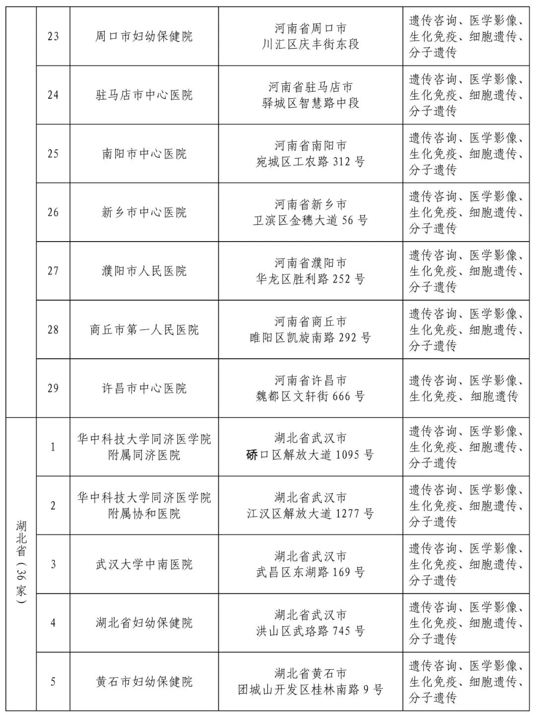 国家卫健委发布了经批准开展产前诊断技术的医疗机构名单(截至 2023 年 6 月 30 日共 527 家,按省级行政区划和机构准入时间排序),其中北京市10家,天津市4家,河北省19家,山西省8家,内蒙古自治区11家,辽宁省22家,吉林省6家,黑龙江省7家,上海市10家,江苏省23家,浙江省22家,安徽省19家,福建省21家,江西省14家,山东省40家,河南省29家,湖北省36家,湖南省28家,广东省73家,广西壮族自治区30家,海南省6家,重庆市6家,四川省23家,贵州省18家,云南省17家,陕西省6家,甘肃省4家,青海省3家,宁夏回族自治区3家,新疆维吾尔自治区9家。详细名单如下。