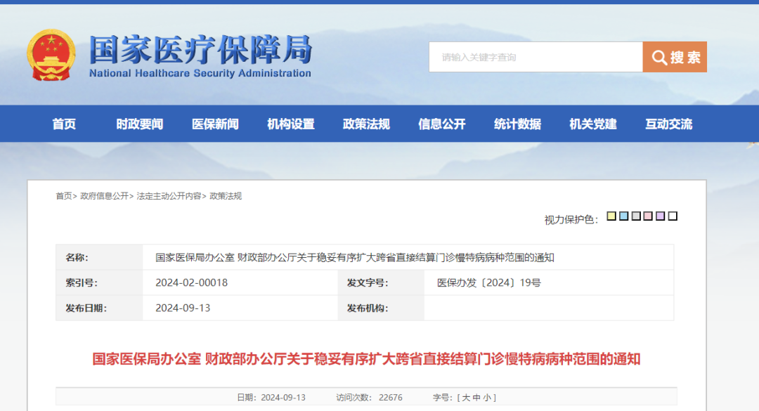 近日,国家医保局办公室会同财政部办公厅印发了《关于稳妥有序扩大跨省直接结算门诊慢特病病种范围的通知》(医保办发〔2024〕19号,以下简称《通知》)。
