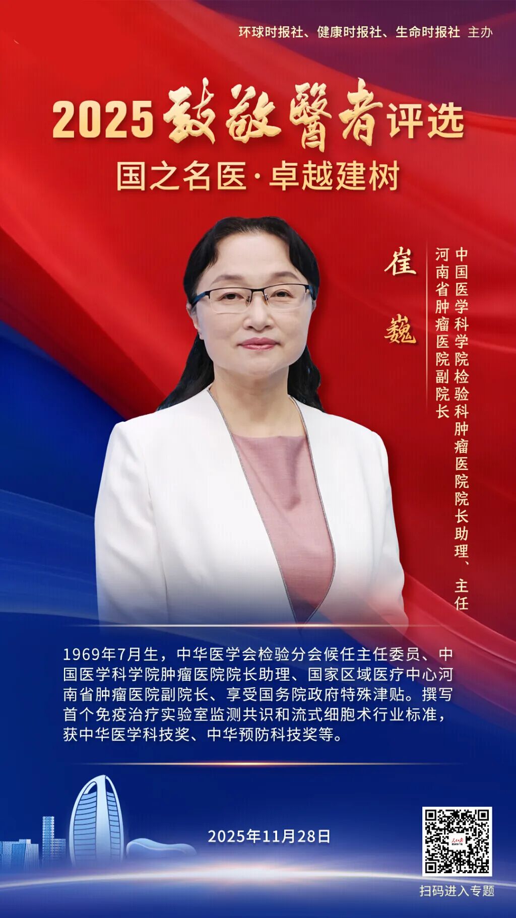 崔巍已经从事临床检验工作近30年,从最基础的常规检验项目的开展,到创新技术的应用,到整个科室流程的管理,崔巍一直坚持在工作第一线。