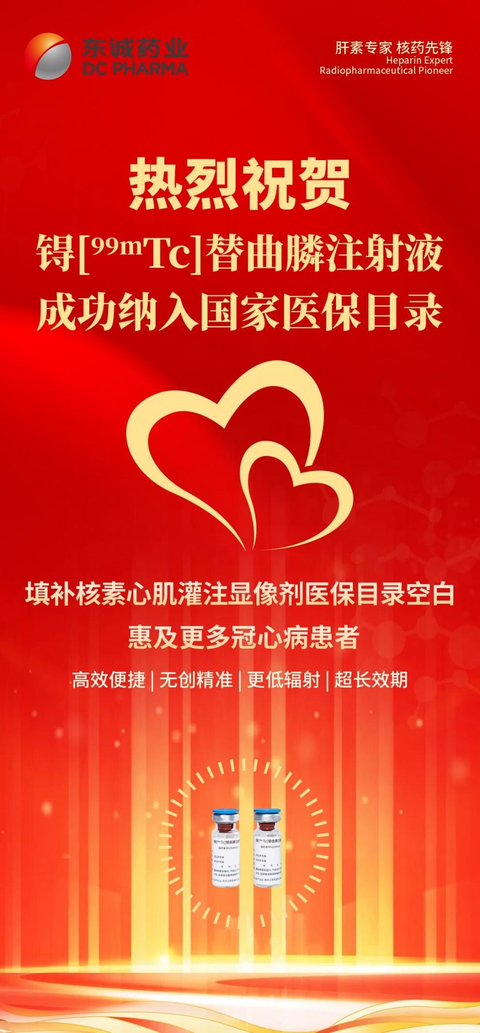 南京江原安迪科(东诚药业全资子公司)生产的锝[99mTc]替曲膦注射液先后经过资料申报、形式审查、专家评审、现场谈判等环节,成功纳入国家医保目录,未来将极大程度减轻患者经济负担,提高患者对SPECT-MPI检查的可及性,促进冠状动脉疾病诊疗精准化。