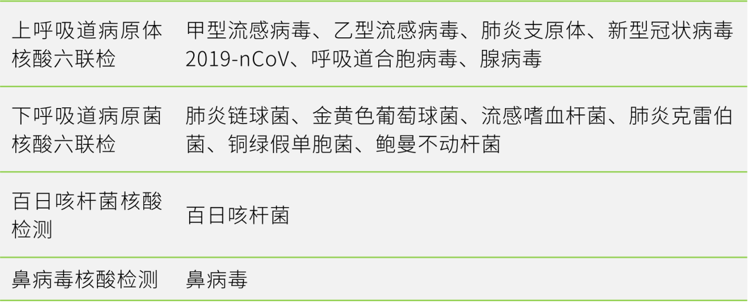核酸”检测平台包括上呼吸道病原体核酸六联检、下呼吸道病原菌核酸六联检和百日咳杆菌核酸检测,6+6+1+1方案灵活组合。